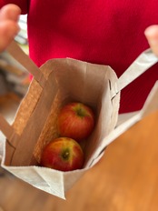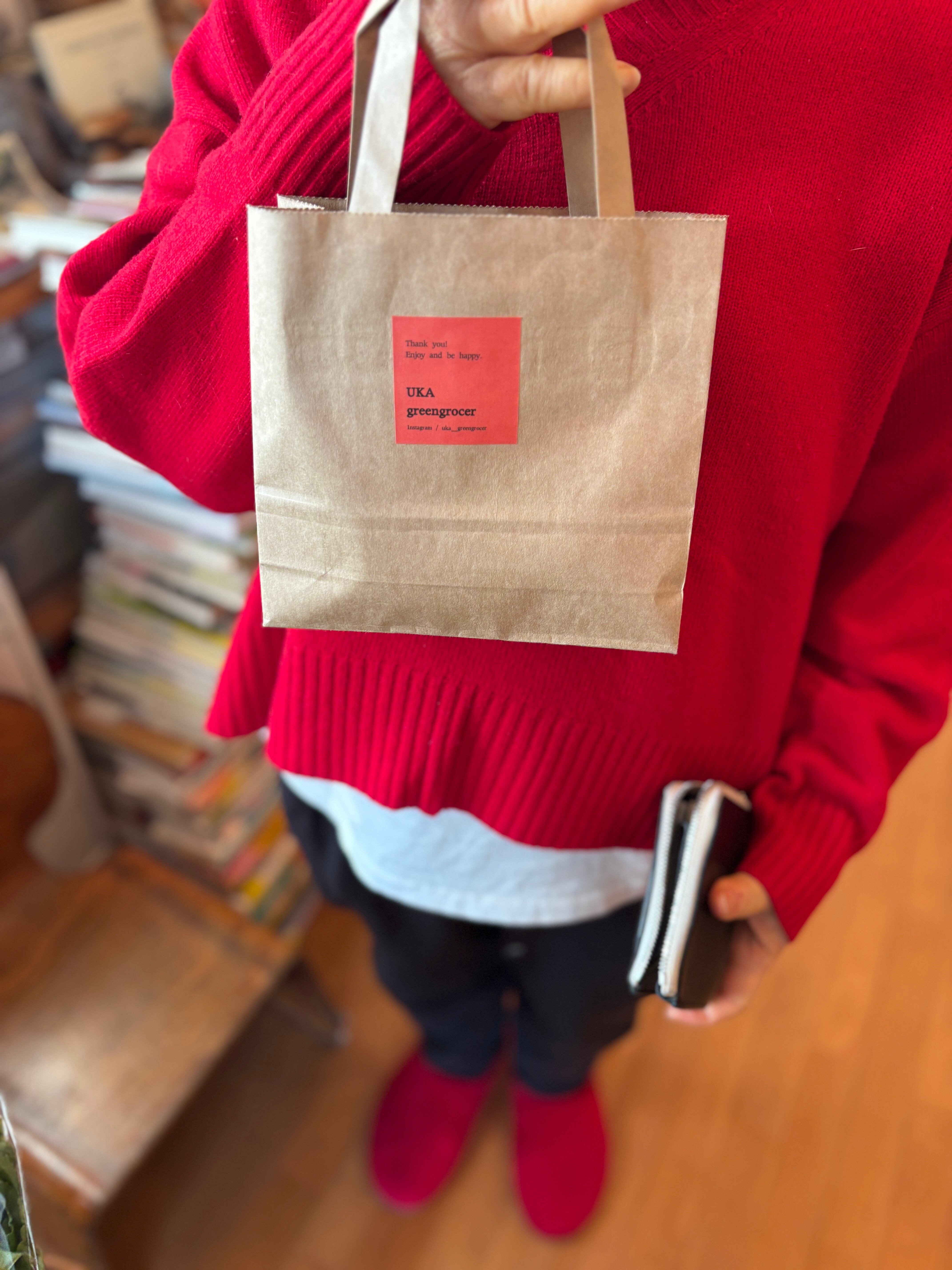 ちょっとした小さな贈り物があると嬉しいシーズン。「美味しくて身体に良いものを贈りたい」というお声もいただきます。UKA Greengrocer の小さな紙袋には、林檎がすっぽり2個入ります。お渡し用の袋をご希望の方は、オプションからお選びください。手土産にしていただくのもお薦めです。紅葉の美しい時期でもあるので、道端で拾ったきれいな落ち葉など添えても粋ですね。